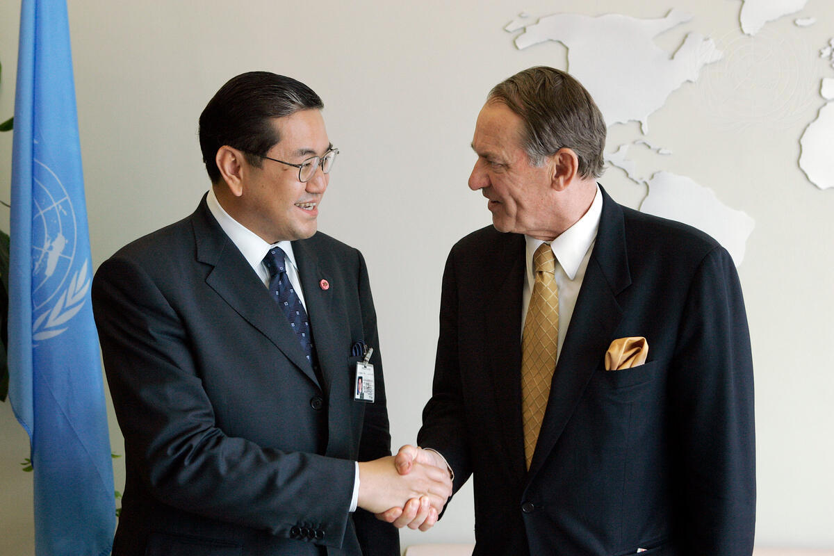 Jan Eliasson (right), President of the sixtieth session of the General Assembly, meets with Surakiart Sathirathai, Deputy Prime Minister of Thailand, at UN Headquarters in New York. The Thai Government nominated the Deputy Prime Minister as candidate for the post of United Nations Secretary General when Kofi Annan completes his term at the end of 2006.