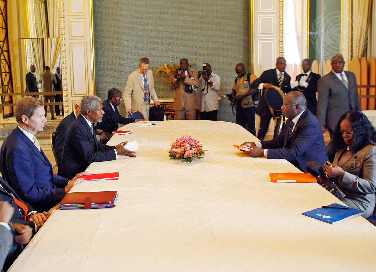 United Nations Secretary-General Kofi Annan (left, centre) and President of Côte d'Ivoire Laurent Gbagbo (right, centre) meet at President Gbagbo's villa.