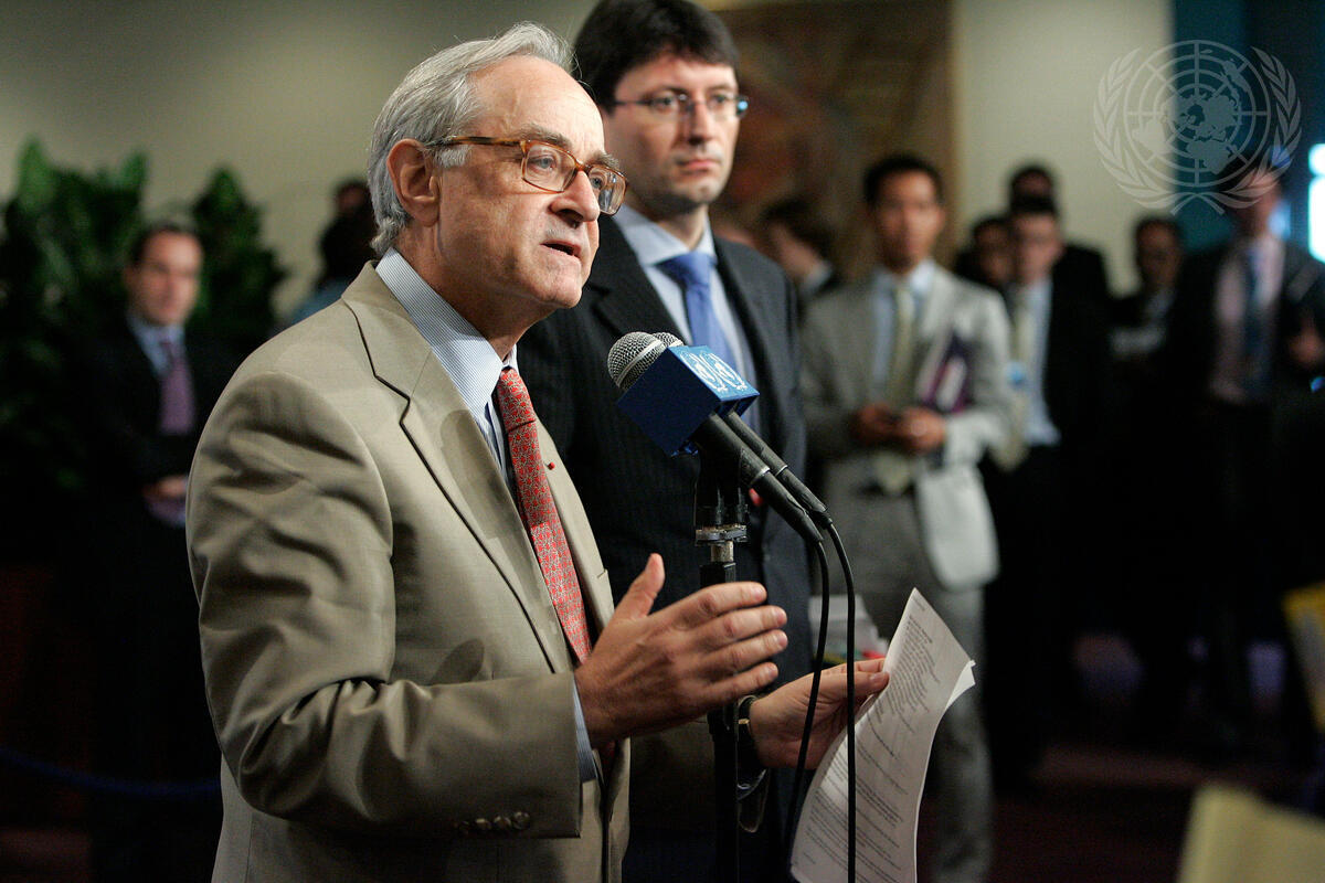 Jean-Marc de La Sablière, Permanent Representative of France to the United Nations and President of the Security Council for the month of July, speaks to correspondents at UN Headquarters in New York.