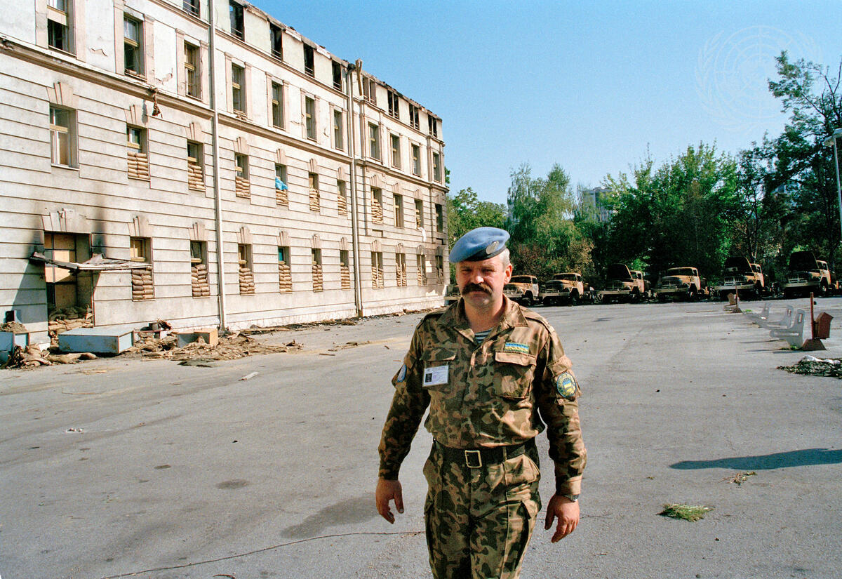 Member of the Ukrainian Battalion outside of a bombed-out building in Sarajevo proper.