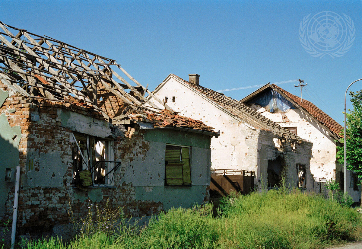 A row of bullet-riddled and bombed houses in the city of Vukovar in the Slavonija region of Croatia.