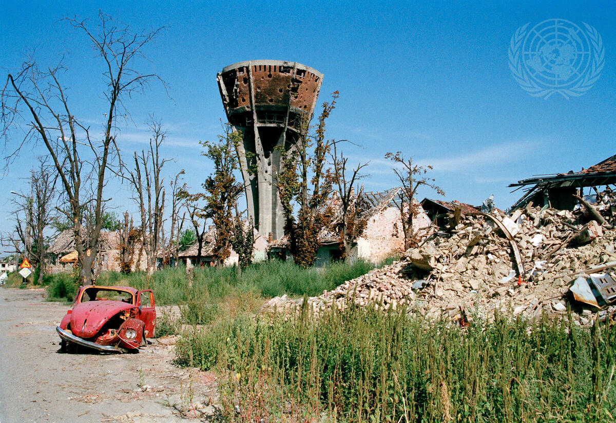 A destroyed car and water tower in Vukovar, damaged during the intense fighting there during the winter of 1991.