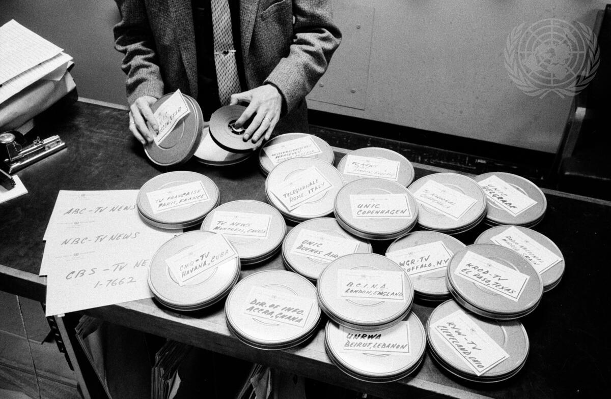 UNTV programmes being prepared for shipment to television stations in many parts of the world.