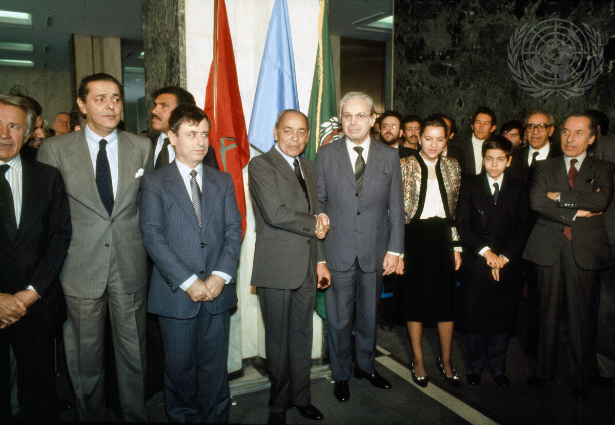 King Hassan II being greeted by Secretary-General Javier Perez de Cuellar (right centre) at UN Headquarters today. To the right of the King is Abdul Halim Khaddam, Deputy Prime Minister and Foreign Minister of the Syrian Arab Republic.