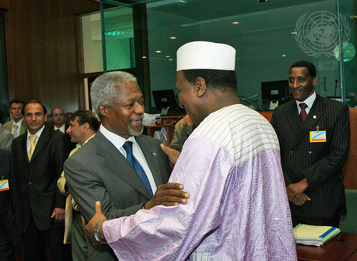 Secretary-General Kofi Annan (left) meets with Alpha Oumar Konaré, Chairman of the Commission of the African Union (AU), during the pledging conference for the African Union Mission in Sudan (AMIS), in Brussels, Belgium. At the conference, Mr. Annan called for an end to hostilities and urged donors to support the African Union mission there, saying it was critical to act now to safeguard the agreement and stop further bloodshed.