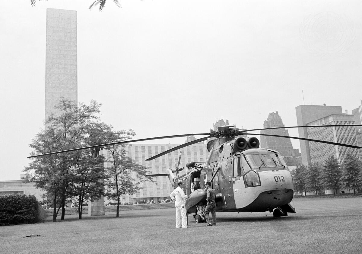 Here, a U.S. Air Force helicopter is seen on a lawn in the north garden at UN Headquarters during today's rehearsals for the live pick-up from Headquarters tomorrow.