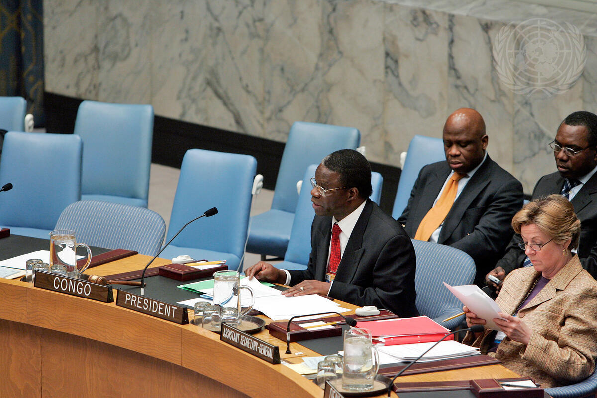 Basile Ikouebe (left), President of the Security Council for the month of May and Permanent Representative of the Republic of the Congo to the United Nations, reads out presidential statements on Côte d'Ivoire and Iraq adopted by the Council following consultations on those two countries and other matters, at UN Headquarters in New York.