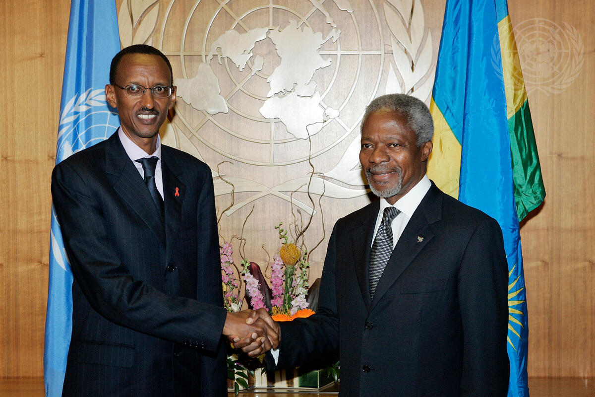 Secretary-General Kofi Annan (right) meets with Paul Kagame, President of Rwanda, at UN Headquarters in New York.