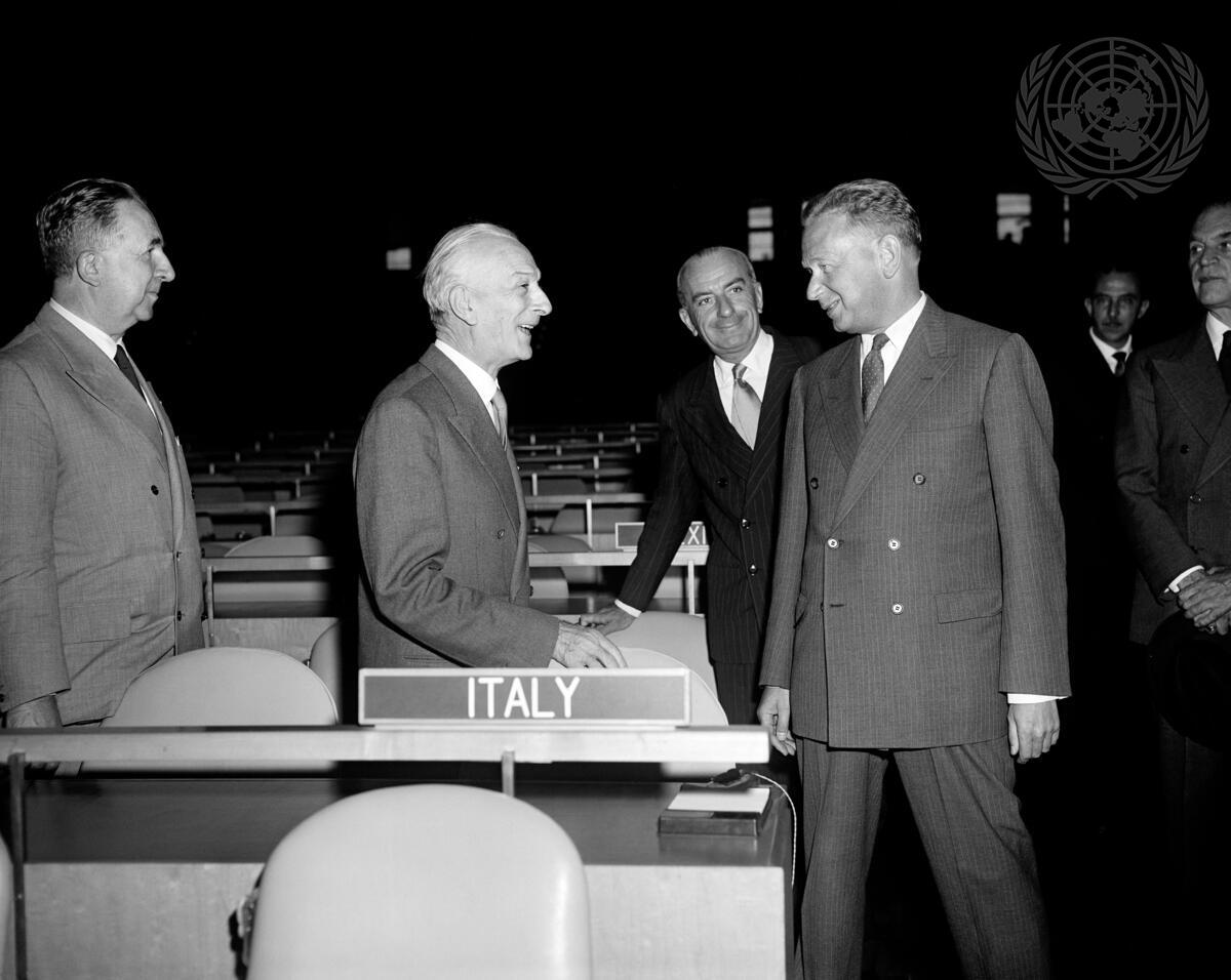 Mr. Giuseppe PELLA (left), the Italian Foreign Minister; UN Secretary-General Dag HAMMARSKJOLD (right, front); and Mr. Egidio ORTONA (behind Mr. Hammarskjold), Permanent Representative of Italy to the United Nations.