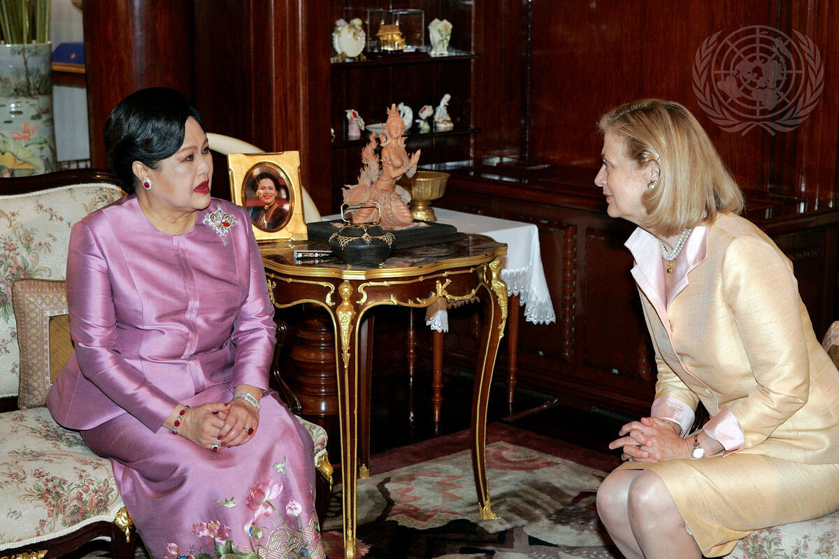 Mrs. Nane Annan (right) talks to Queen Sirikit at the Royal Residence in Thailand.