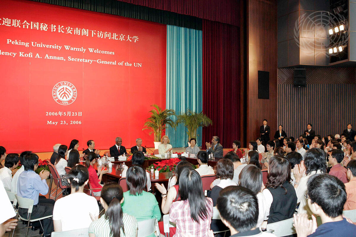 Secretary-General Kofi Annan talks to students at Beijing University. Left to right are: Guangya Wang, Permanent Representative of China to the United Nations, Mr. Annan; Xu Zhihong, President of the University; and Mrs. Annan.