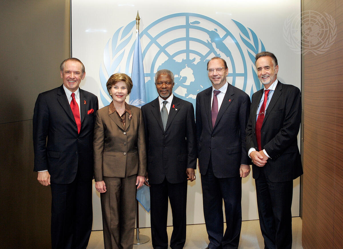 Secretary-General Kofi Annan (third from left) meets with Laura Bush (second from left), First Lady of the United States of America, at UN Headquarters in New York. Also in the picture are Jan Eliasson (left), President of the sixtieth session of the General Assembly; Peter Piot (fourth from left), Executive Director of the Joint United Nations Programme on HIV/AIDS, (UNAIDS) and; Richard Feachum, Executive Director of the Global Fund.