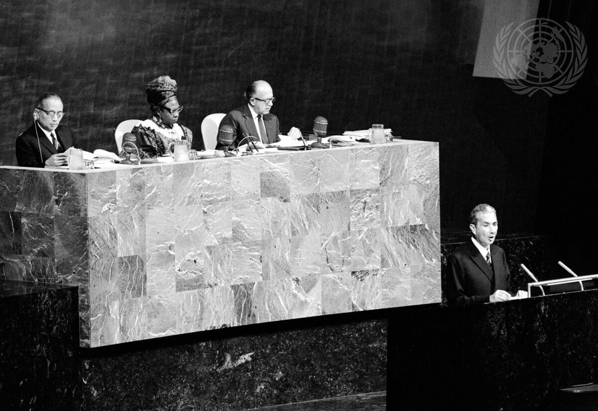 Speaking is Aldo Moro, Italy's Foreign Minister. On the podium is Secretary-General U Thant, the President of the General Assembly, Angie E. Brooks (Liberia) and Constantin A. Stavropoulos.