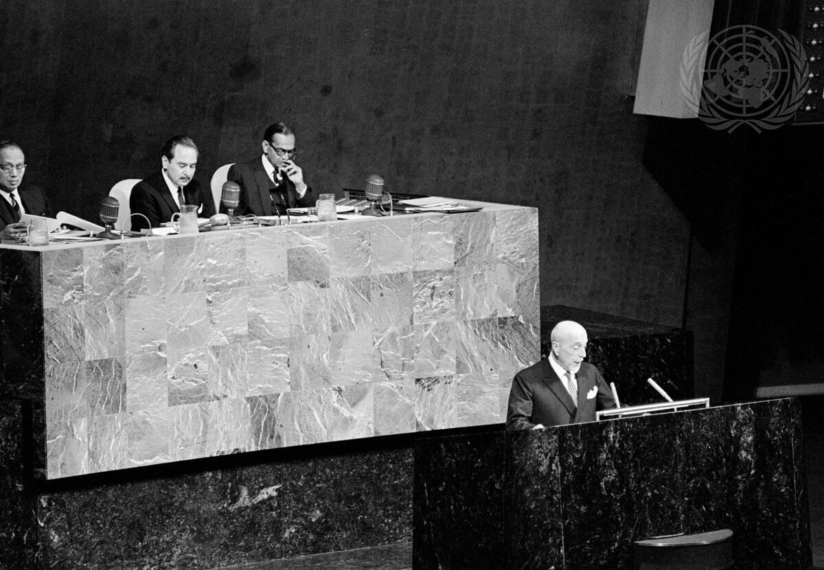 Giuseppe MEDICI, Minister for Foreign Affairs of Italy, addressing the Assembly. At the presidential rostrum, from left: Secretary-General U THANT, Assembly President Emilio ARENALES (Guatemala), and C. V. NARASIMHAN, Under-Secretary-General for General Assembly Affairs and Chef de Cabinet.