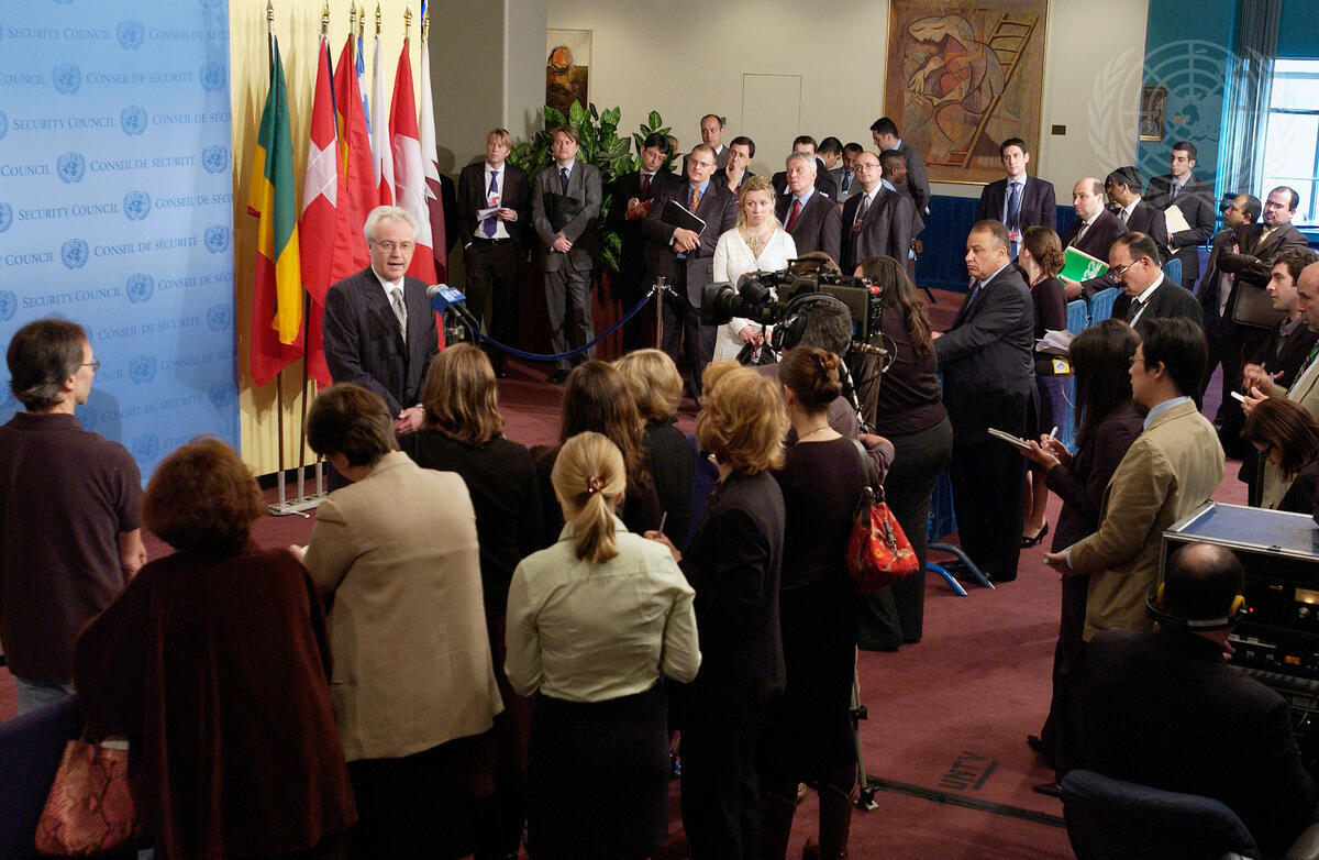 Vitaly I. Churkin, Permanent Representative of the Russian Federation to the United Nations, addresses correspondents outside the Security Council chamber at UN Headquarters in New York.