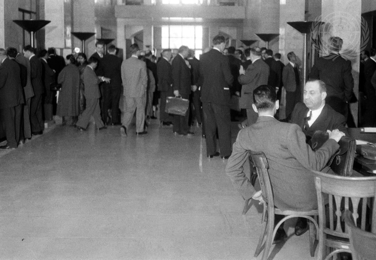 In this photograph, taken at the Palais des Nations where the Conference on the Law of the Sea is being held, delegates are arriving and gathering in the Assembly lobby.