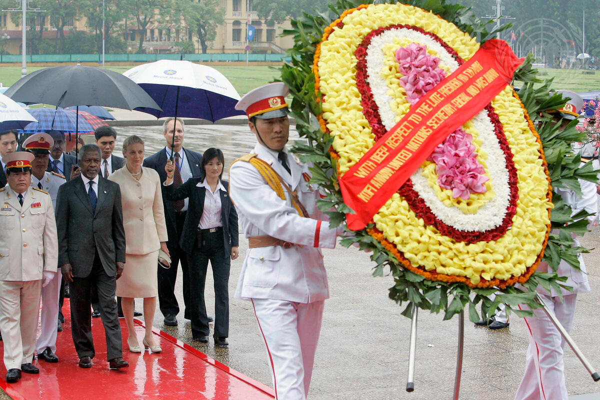 Secretary-General Kofi Annan and Mrs. Nane Annan are escorted at a wreath laying ceremony and tour of Ho Chi Minh Mausoleum in Hanoi.