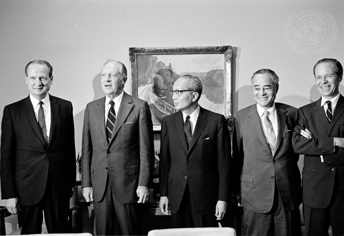Seen here prior to today's meeting, from left to right are: Gunnar Jarring; US Secretary of State, William Rogers; U Thant; Ralph J. Bunche, Under-Secretary-General for Special Political Affairs; and Charles W. Yost, Permanent Representative of USA to UN.