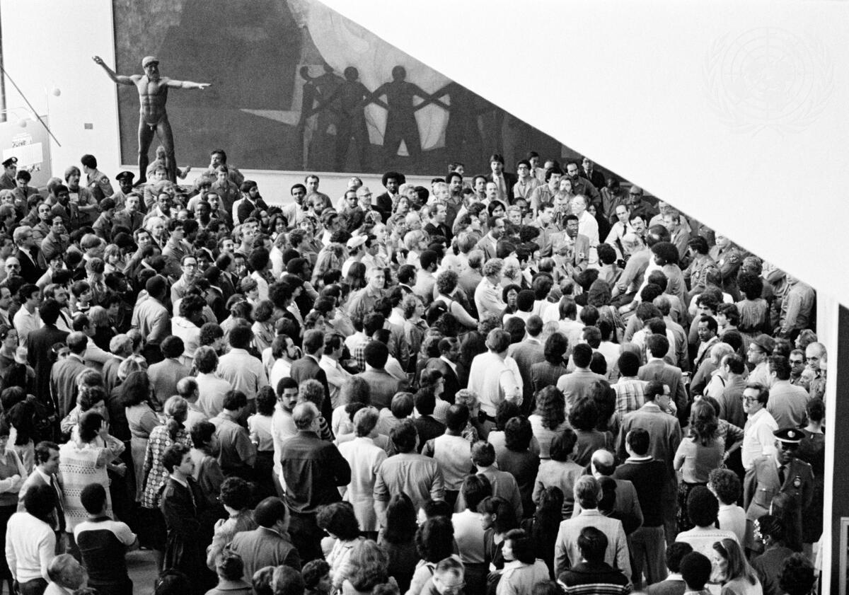 Staff members gathered at the public lobby before proceeding to the Fifth Committee conference room to listen to the Chairman of the Staff Committee, Andreas Kahnert.
