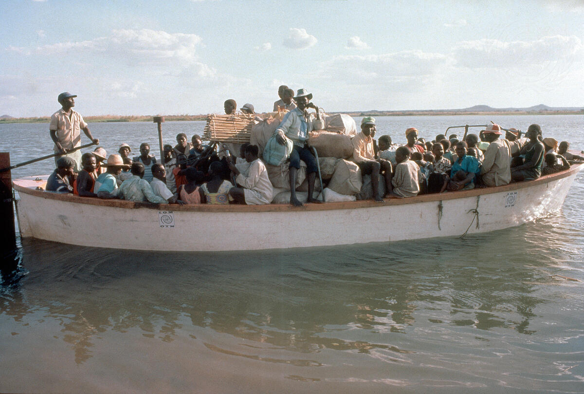 Returnees from Malawi cross the Zambezi River.