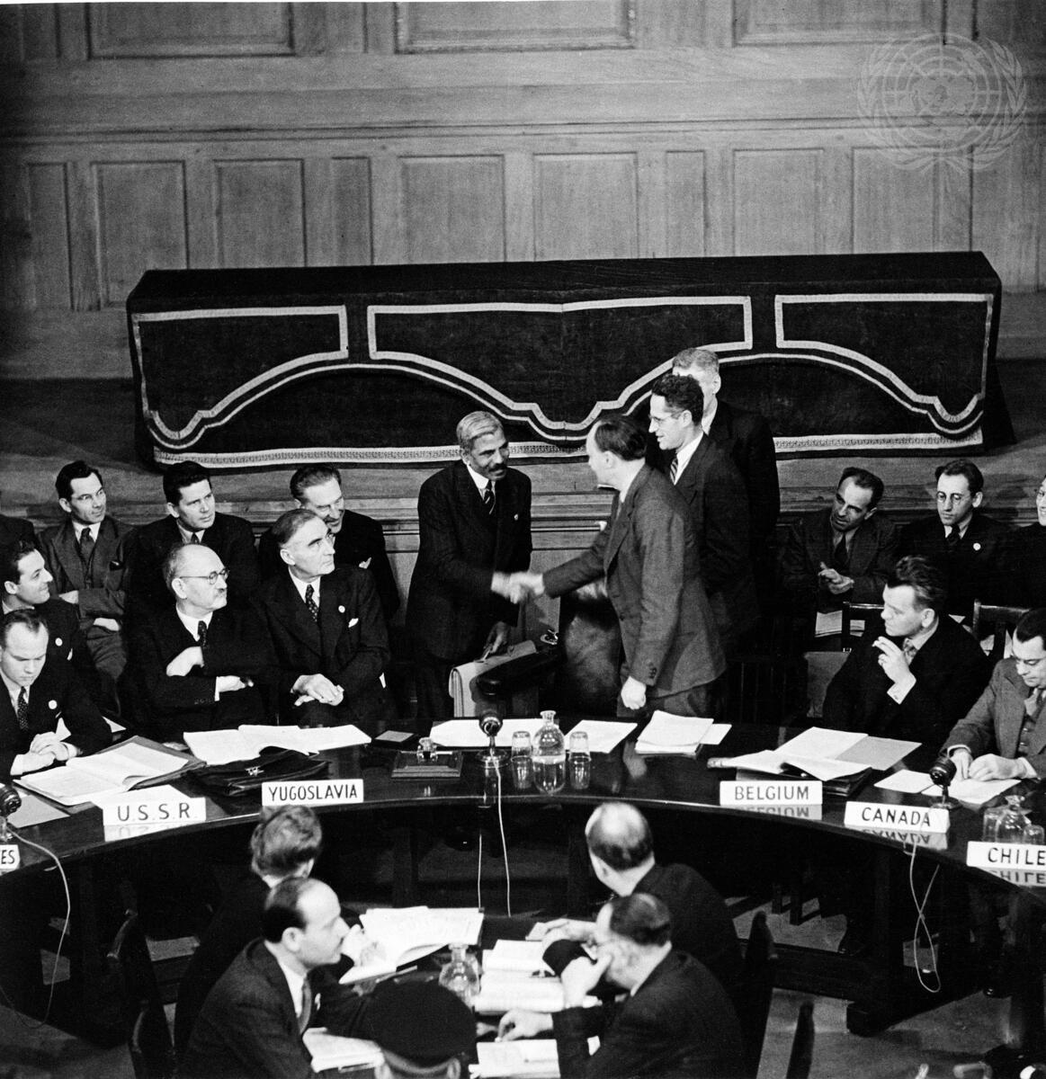 This picture was taken when the Council - at its 1st session- elected Sir Ramaswami Mudaliar, of India, as its President for the first period of office; it shows Mr. Gladwyn Jebb (right), Executive Secretary of the UN congratulating Sir Ramaswami upon his election. Sir Ramaswami was unable to be present at the 3rd session, but the Council,at its 4th session, re-elected him President for the second period of office.