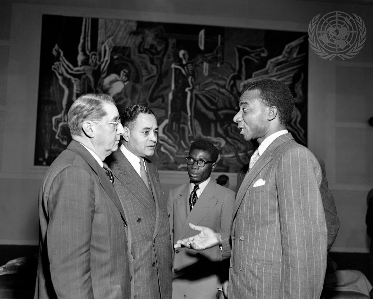 Upon the invitation of the Trusteeship Committee, the representatives of the Ewe tribe presented to the United Nations their views on the situation in Togoland. Here are two of them at the U.N. Headquarters in Paris with Mr.Gerig of the U.S and Dr. Bunche. Left to right: Mr. Benjamin Gerig, USA, Adviser, Dr. Ralph Bunche, Director of Trusteeship Division, Mr. Ahborg, Togoland and Mr. S.E. Olympio, Head of the Togoland delegation.