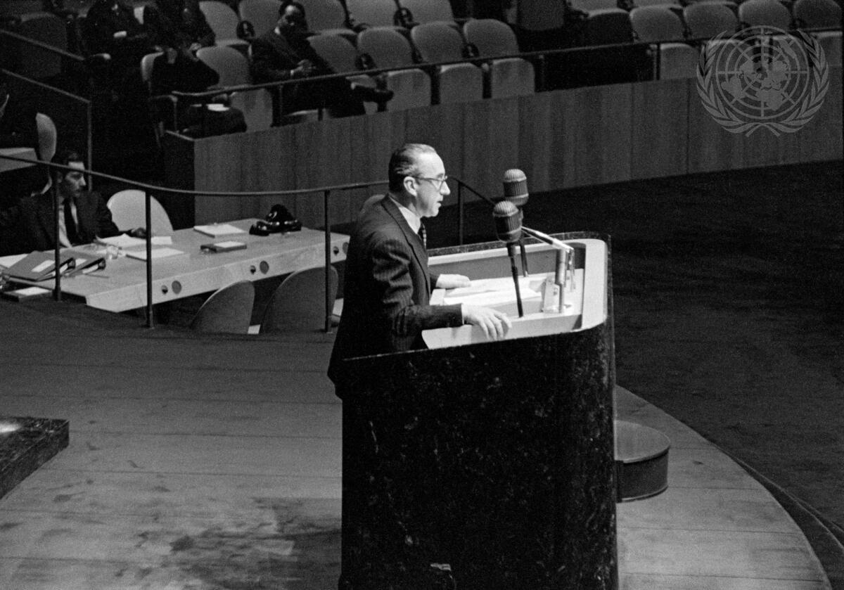 Ambassador Alberico Casardi, Representative of Italy addressing this morning's plenary meeting of the United Nations General Assembly. Italy is one of the 16 States which were recently admitted to membership in the United Nations.