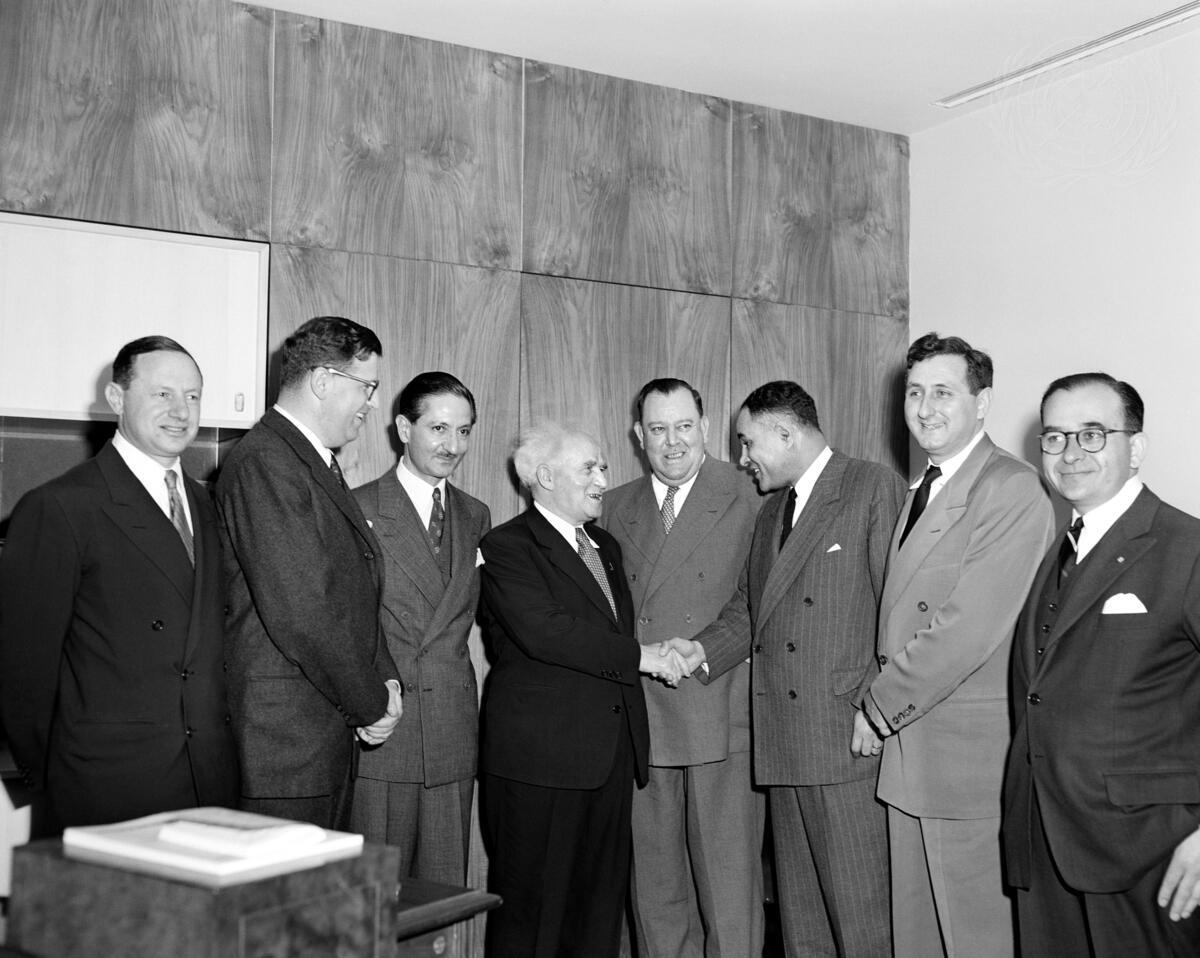 Mr. David Ben-Gurion, Prime Minister of Israel, pays an official visit to United Nations Headquarters. This picture was taken in the office of the President of the General Assembly; it shows (left to right) Mr. Arthur Lourie, Deputy Representative of Israel to U.N.; Ambassador Abba S. Eban, Permanent Representative; Ambassador Nasrollah Entezam of Iran, President of the General Assembly; Mr. David Ben-Gurion; Mr. Trygvie Lie, U.N. Secretary-General; Dr. Ralph Bunche, Director of the Division of Trusteeship, and former Acting Mediator in Palestine; Mr. Gideon Rafael, Alternate Representative of Israel to U.N.; and Mr. Moshe Tov, also Alternate Representative.