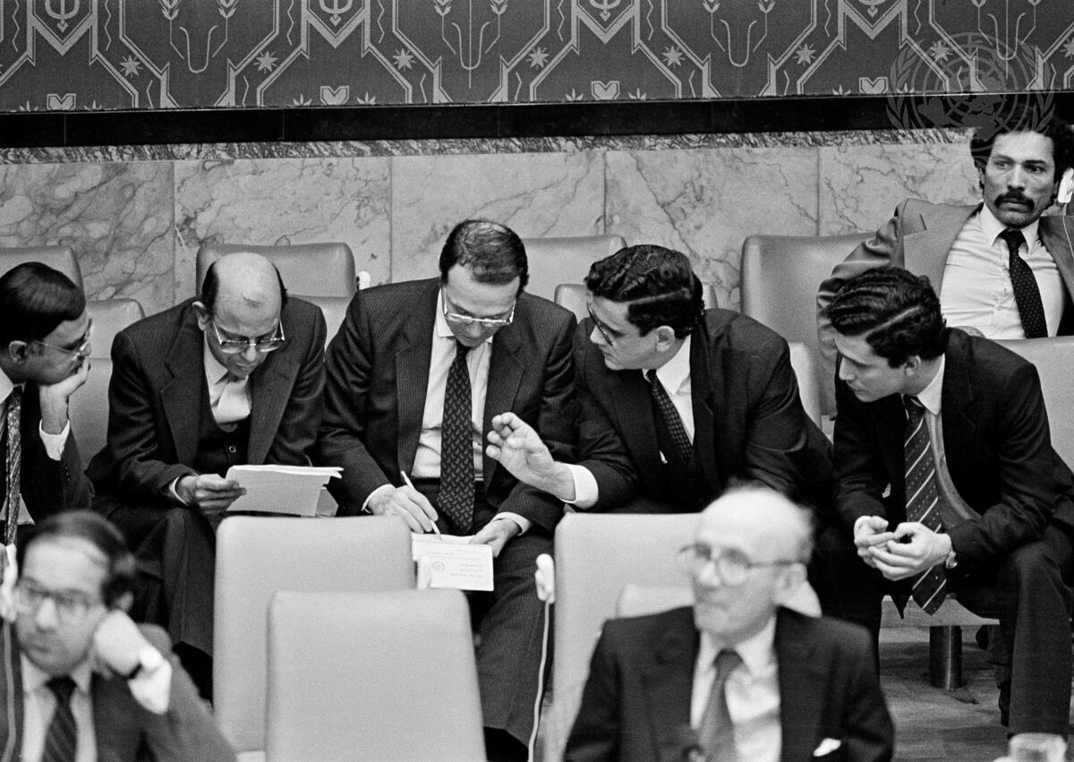 Conferring informally on the draft resolution before the start of the meeting are, beginning 2nd from left, Natarajan Krishnan (India), Ahmed Tawfik Khalil (Egypt) and Javier Chamorro Mora (Nicaragua).