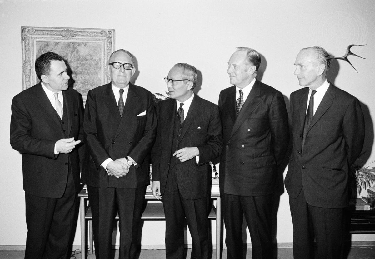 The Foreign Ministers of four major world powers met with United Nations Secretary-General, U Thant at UN Headquarters today. They are here to attend the commemorative session for the twenty-fifth anniversary of the United Nations. From left to right are: Andrei Gromyko (USSR); Maurice Schumann (France); U Thant; William P. Rogers (USA); Sir Alec Douglas-Home (United Kingdom).