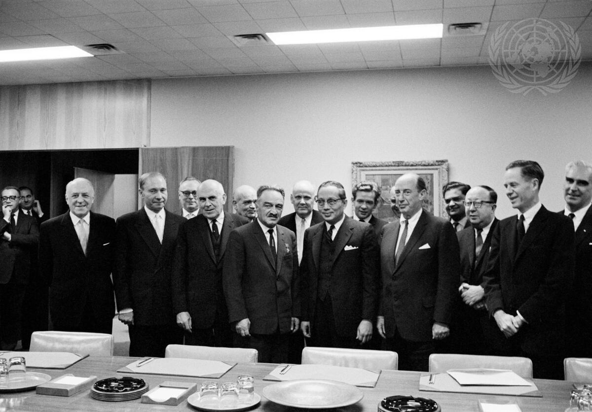 Front row (l. to r.): Mr. V.A. Zorin (USSR); Mr. V.V. Kuznetsov (USSR); Mr. J. J. McCloy (United States); Mr. A.I. Mikoyan; U Thant; Mr. A. E. Stevenson (United States); Mr. C.W. Yost (United States). Back row: Mr. L.I. Mendelevich (USSR); Mr. O. Loutfi, UN Under-Secretary for Special Political Affairs; Mr. P. D. Morozov (USSR); Mr. V. N. Zherebtsov, Interpreter, USSR Mission; Brigadier I. J. Rikhye, Military Adviser to the Secretary-General; Mr. E.D. Kiselev, Under-Secretary for the UN Department of Political and Security Council Affairs; and Mr. H. Tavares De Sa, Under-Secretary for the UN Office of Public Information.