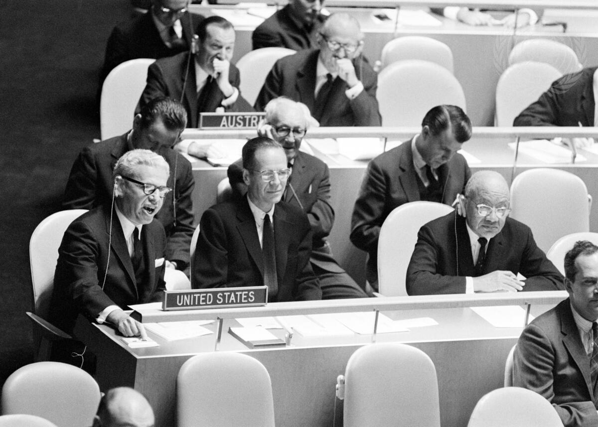 Arthur J. Goldberg (left), Permanent Representative of the United States to the UN, casting his vote. At the table with him are Charles W. Yost (centre), Deputy Permanent Representative, and James M. Nabrit, Jr., Deputy Representative on the Security Council.