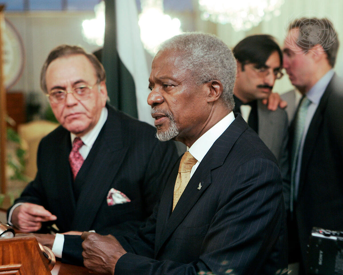 Secretary-General Kofi Annan (second from left) and Pakistani Foreign Minister Khurshid Mehmud Kasuri, address the press after their meeting at the Foreign Minister's office in Islamabad, Pakistan