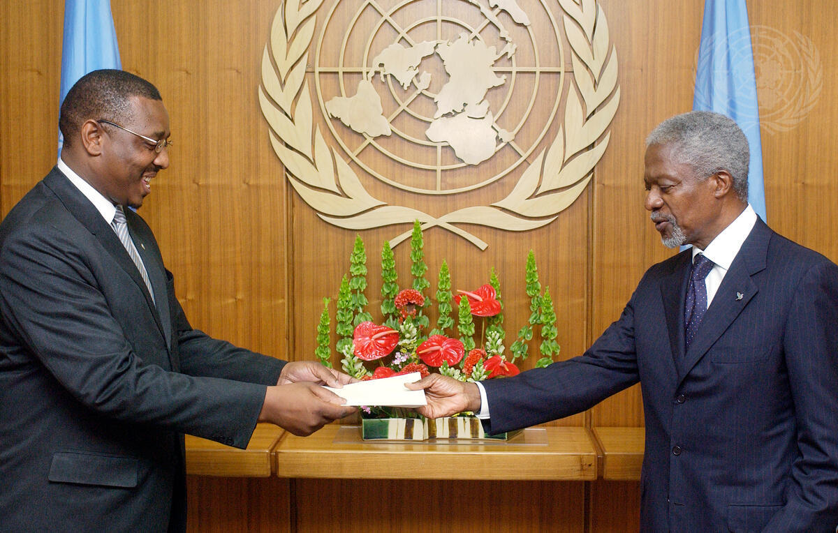 Lebohang Fine Maema (left), the new Permanent Representative of Lesotho to the United Nations, presents his credentials to Secretary-General Kofi Annan, today at UN Headquarters.