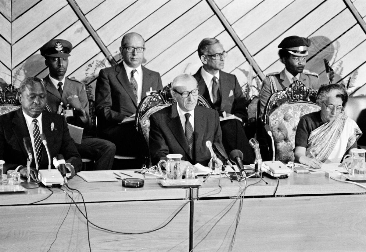Secretary-General Kurt Waldheim addressing the opening meeting of the Conference on 10 August. Next to him are President Daniel T. arap Moi of Kenya (left) and Prime Minister Indira Gandhi of India (right).