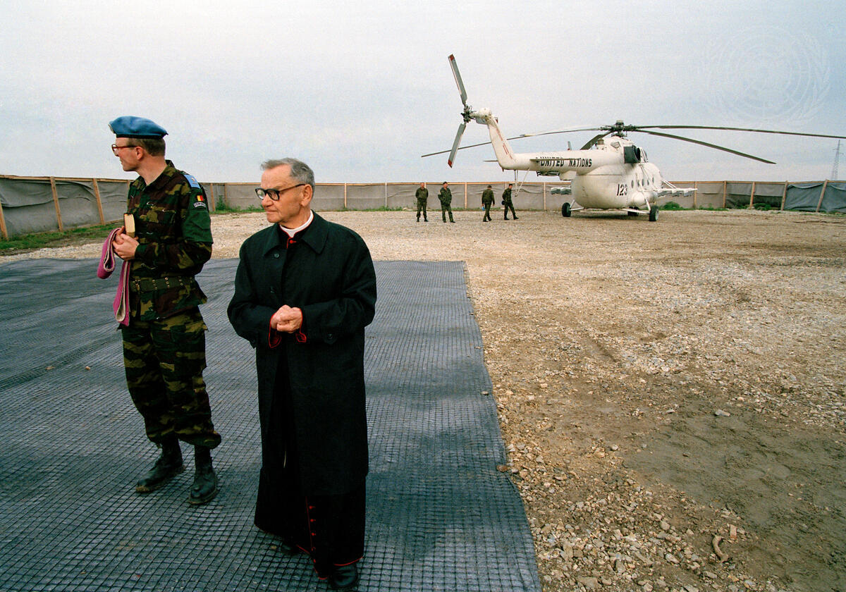 A Belgium military priest and a civilian priest from Zagreb prepare for the mass at a grave site at Ovcara, where approximately 200 civilians were massacred in 1994. The month before, the International Criminal Tribunal for the Former Yugoslavia had the site exhumed and inspected it. [c. November 1996]