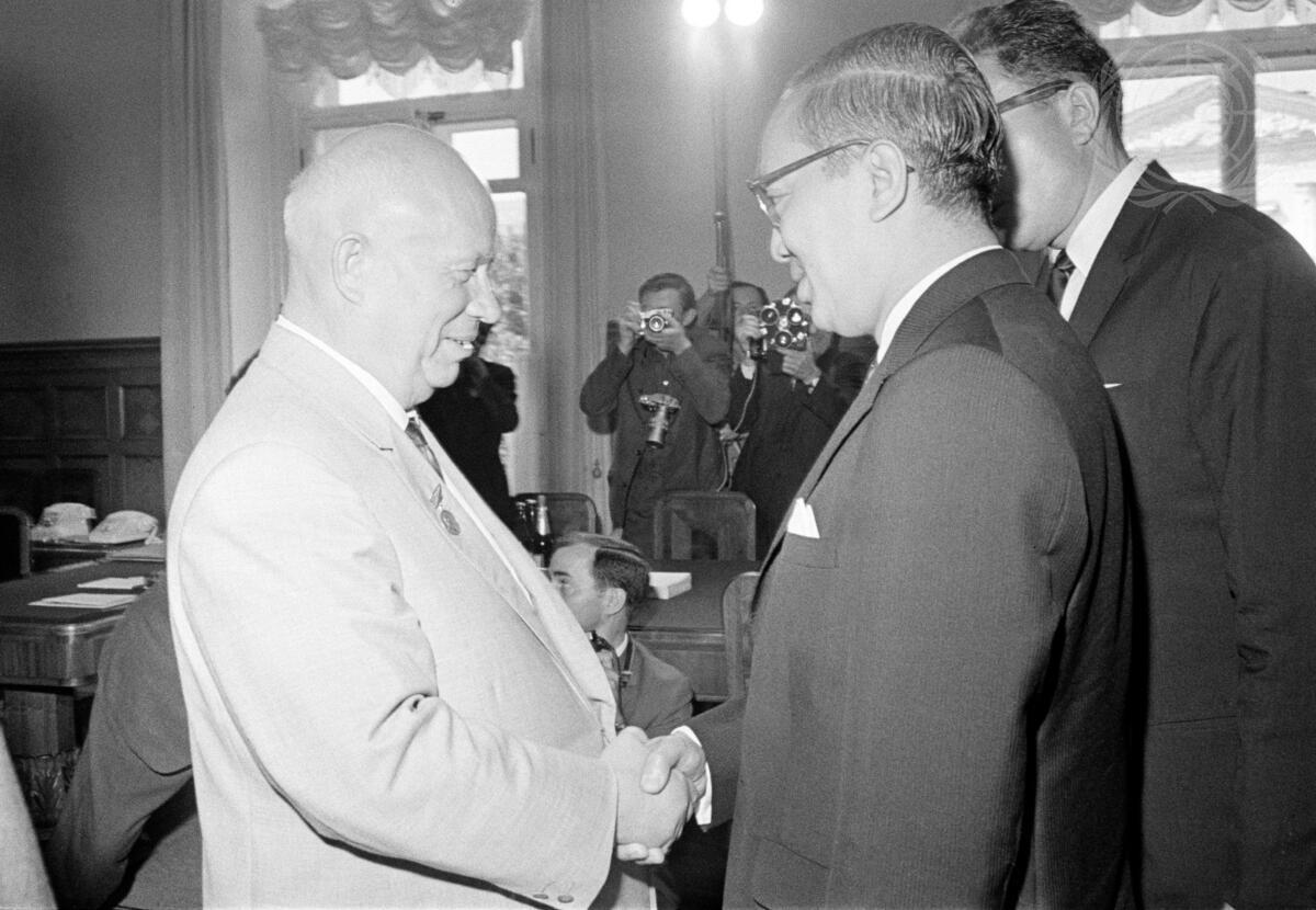 Secretary-General U THANT (right) is seen being greeted by Chairman Khrushchev, as he arrived at the Kremlin.