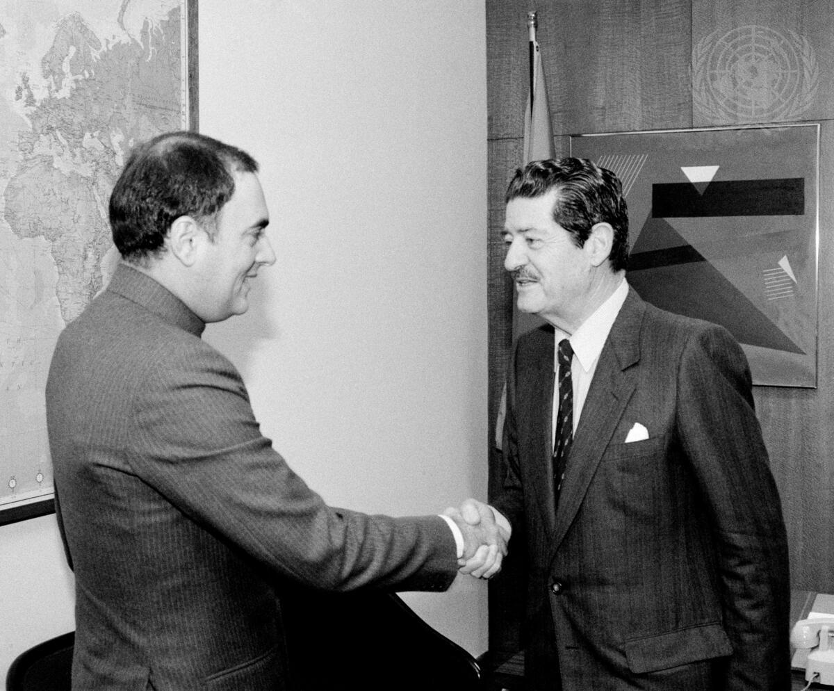 General Assembly President Don Jaime de Pinies (Spain), at right, meeting in his United Nations Headquarters office today with Rajiv Gandhi, Prime Minister of India.