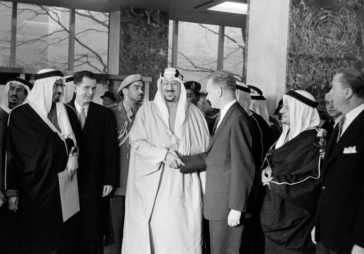 UN Secretary-General Dag Hammarskjöld greeting His Majesty King Sa'ud upon the latter's arrival at U.N. Headquarters.