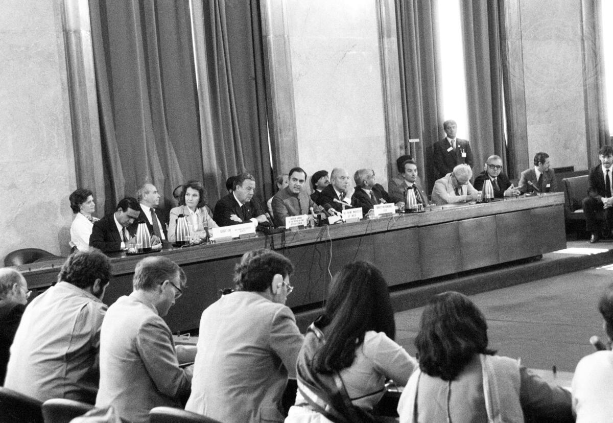 Prime Minister Rajiv Gandhi of India (fourth from left) paid an official visit to the European Office of the United Nations at Geneva on 17 June 1985. The Prime Minister held a press conference during his visit to the UN Office.