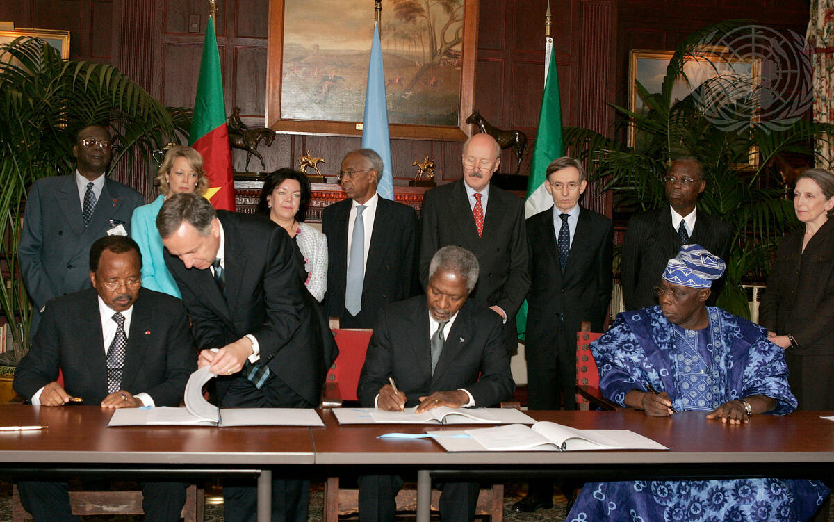 Secretary-General Kofi Annan (centre) is pictured with Nigerian President Olusegun Obasanjo (right) with his Cameroonian counterpart Paul Biya (left) at the signing of the agreement regarding their dispute over the Bakassi Peninsula, in Greentree, Long Island in New York.