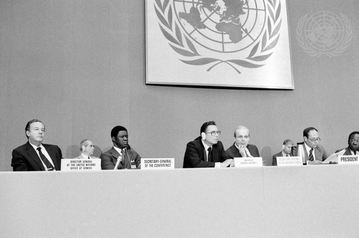 Seen at the presiding table during the meeting are, from left, Erik Suy, Director-General, UN Office at Geneva; James O. Johan; Imre Hollai (Hungary); Javier Perez de Cuellar; Hector Charry Samper (Colombia); and E. Palmer, Chief, Racial Discrimination Task Force, Centre for Human Rights, who is Conference Secretary.