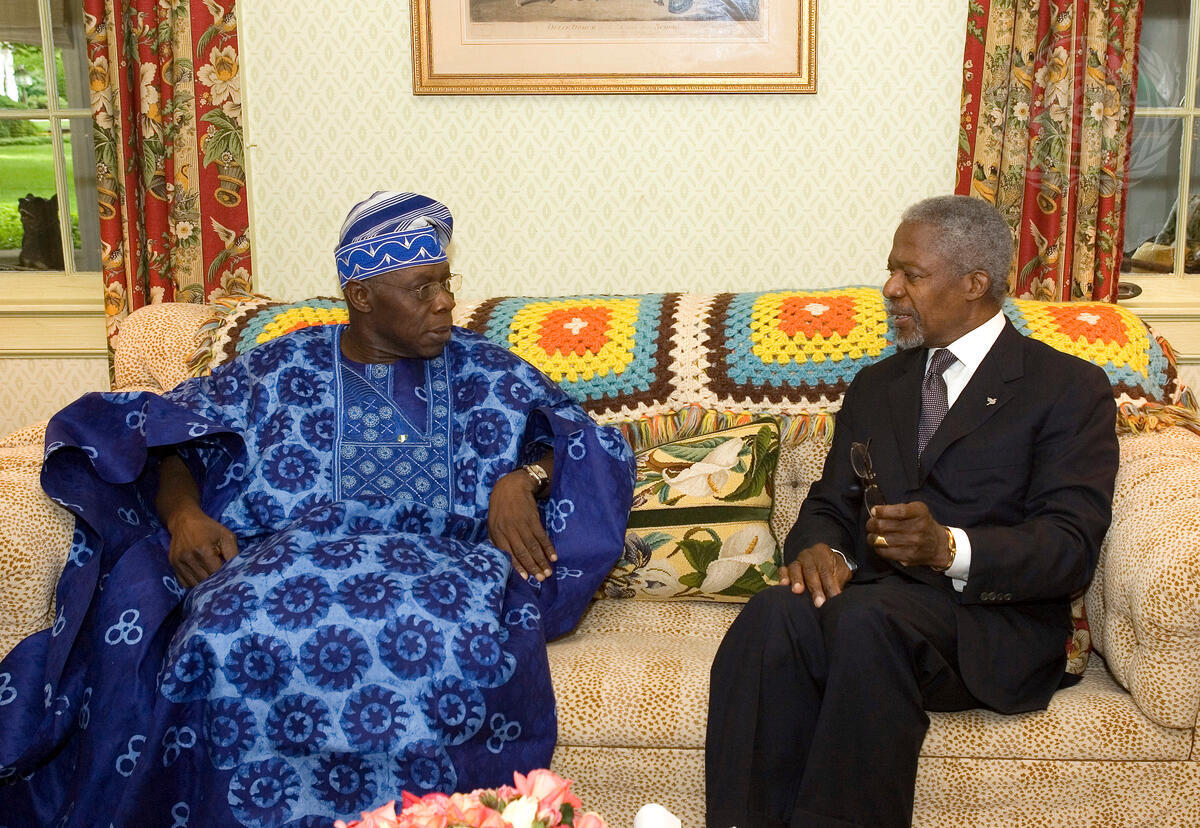 Secretary-General Kofi Annan (right) talks with Nigerian President Olusegun Obasanjo before the start of the meeting of the Cameroon-Nigeria Mixed Commission in Greentree, Long Island in New York, over the Bakassi Peninsula issue.