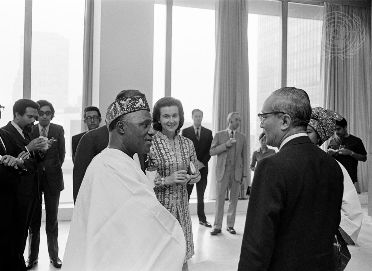 Seen here in discussion with Chief S.O. Adebo, Executive Director of UNITAR (left), is Secretary-General U Thant.