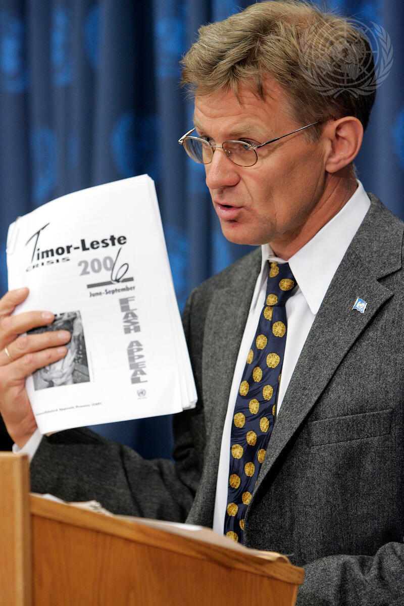 Jan Egeland, the Under-Secretary-General for Humanitarian Affairs, addresses correspondents when he launched an appeal for Timor-Leste, at UN Headquarters in New York.