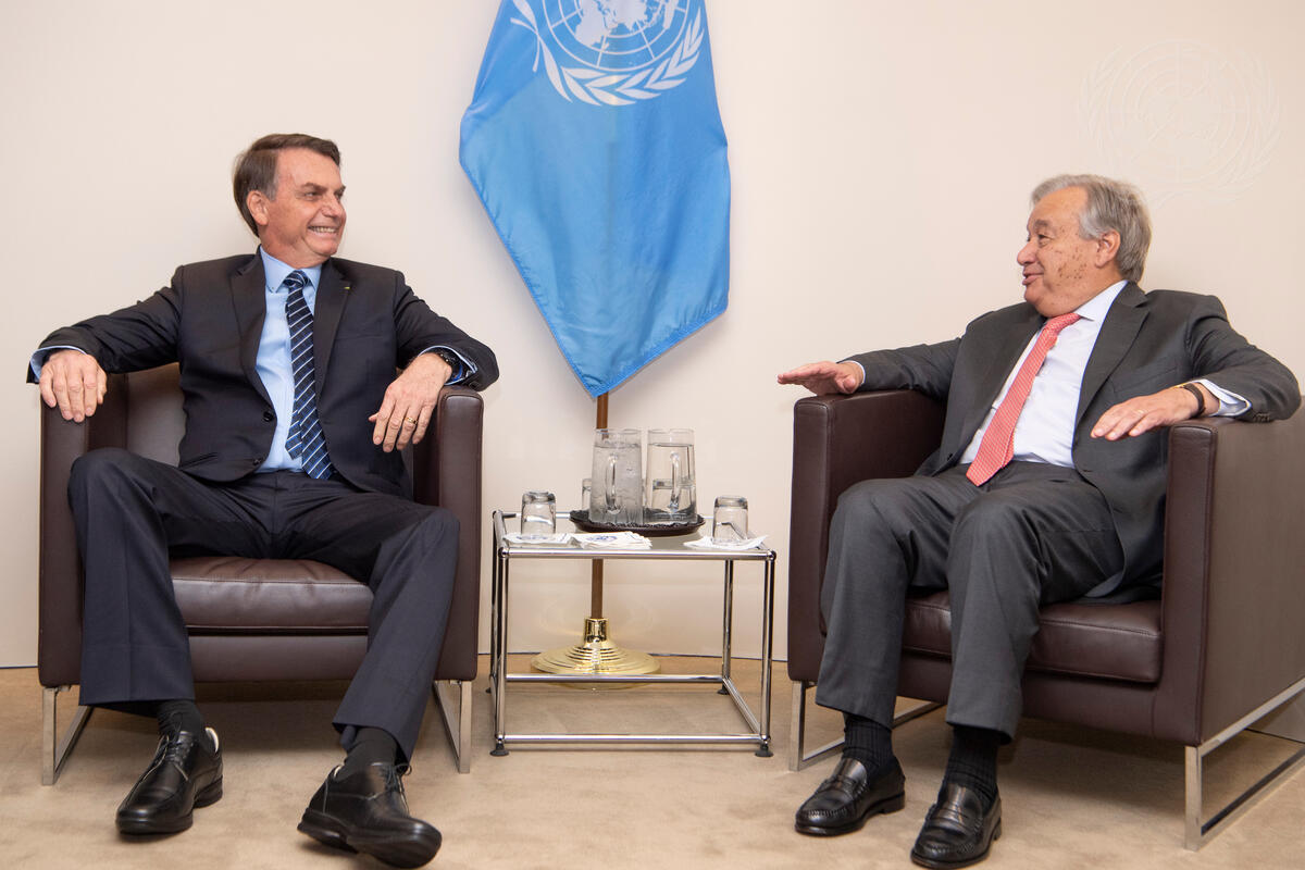 Secretary-General António Guterres (right) meets with Jair Messias Bolsonaro, President of the Federative Republic of Brazil.