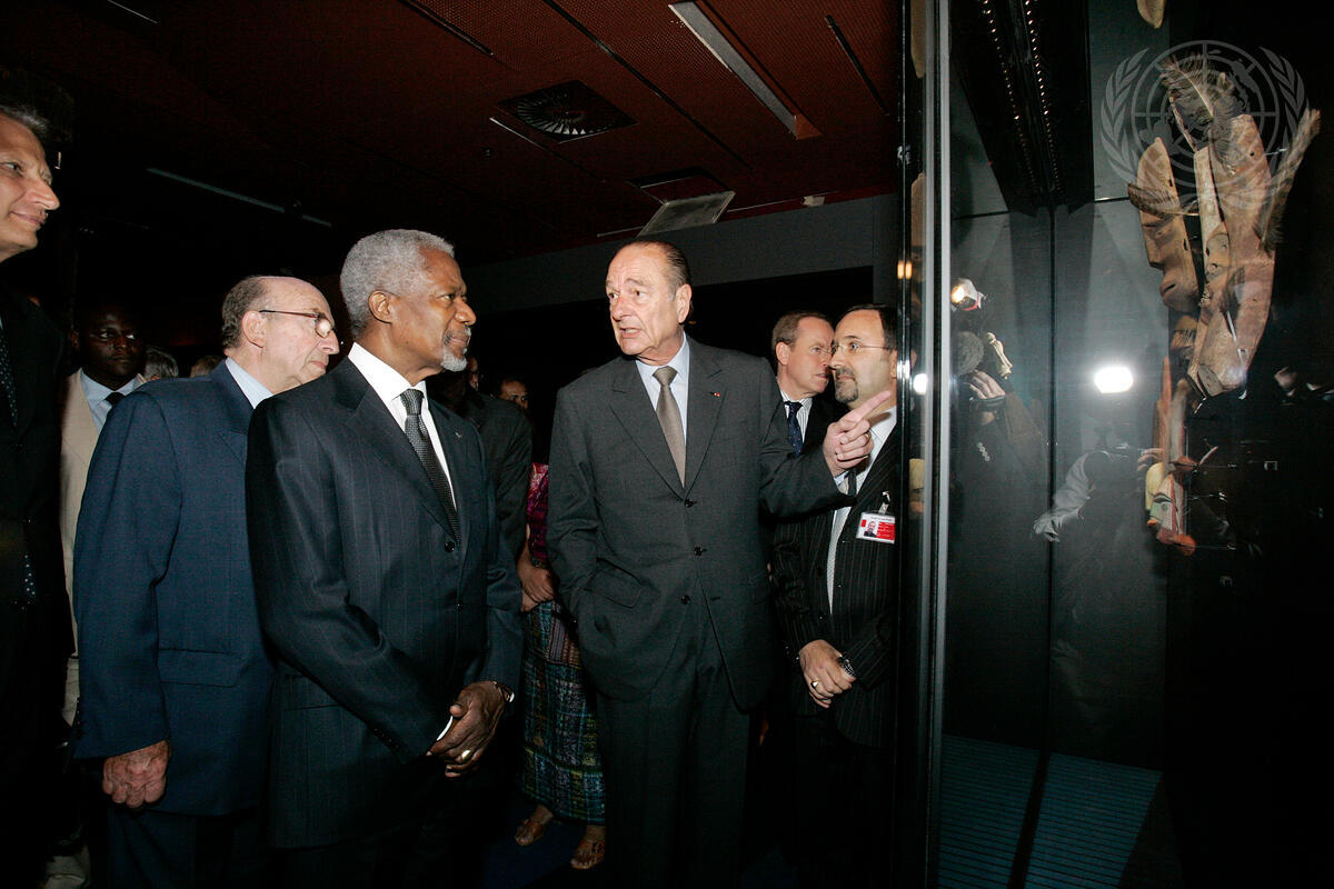 Secretary-General Kofi Annan (second from left) listens to French President Jacques Chirac (right), when he was taken around the newly-opened Musée des Arts Premiers, at Musée du Quai Branly in Paris, France.