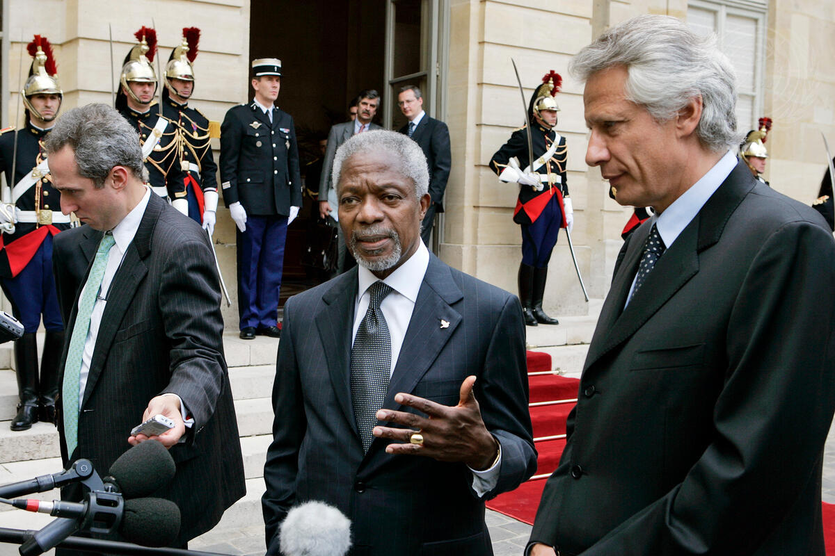 Secretary-General Kofi Annan (centre) talks to journalists after he met with French Prime Minister Dominique de Villepin (right) over a working lunch, in Paris.