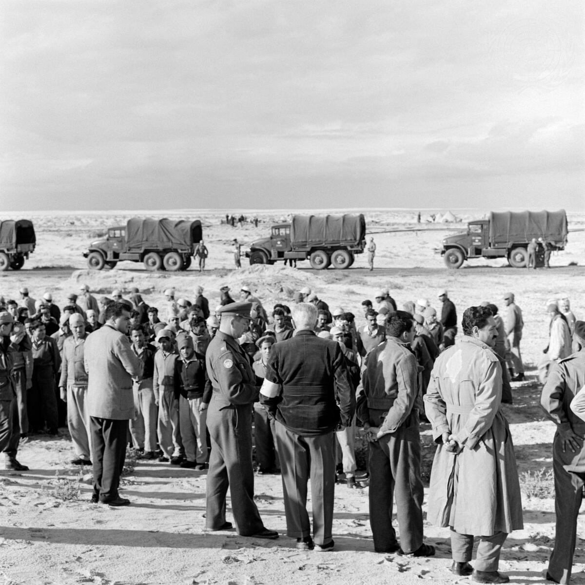 This photo, taken at Misfaq, shows a group of prisoners being lined up for their transfer to the Egyptian authorities, as UNEF, Red Cross and press observers look on. The trucks in which the prisoners arrived are still on the road in the background.