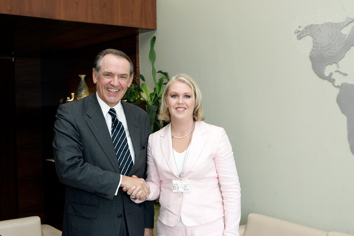Jan Eliasson (left), President of the sixtieth session of the General Assembly, greets Lena Hallengren, Minister for Pre-School Education, Youth Affairs and Adult Learning of Sweden, who called on him, today at United Nations Headquarters.